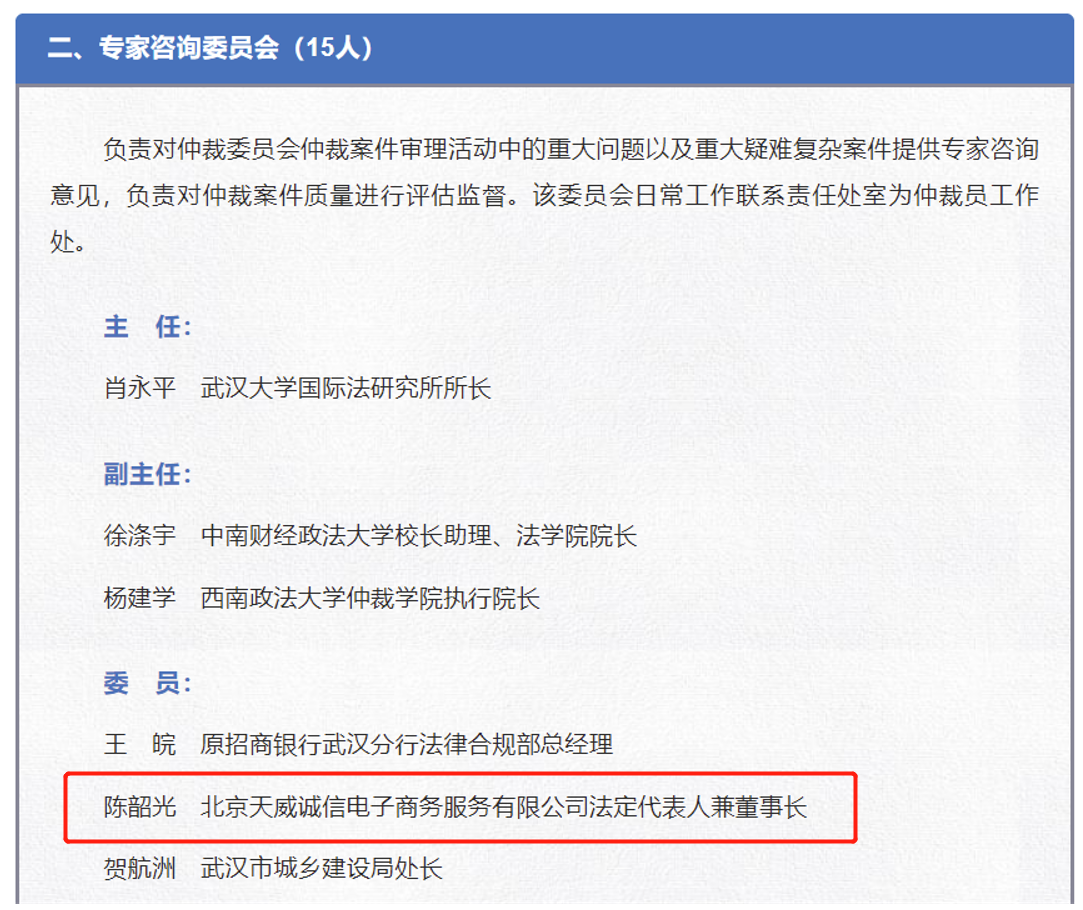 重磅 | 天威诚信董事长陈韶光女士入选武汉仲裁委员会专家咨询委员会委员
