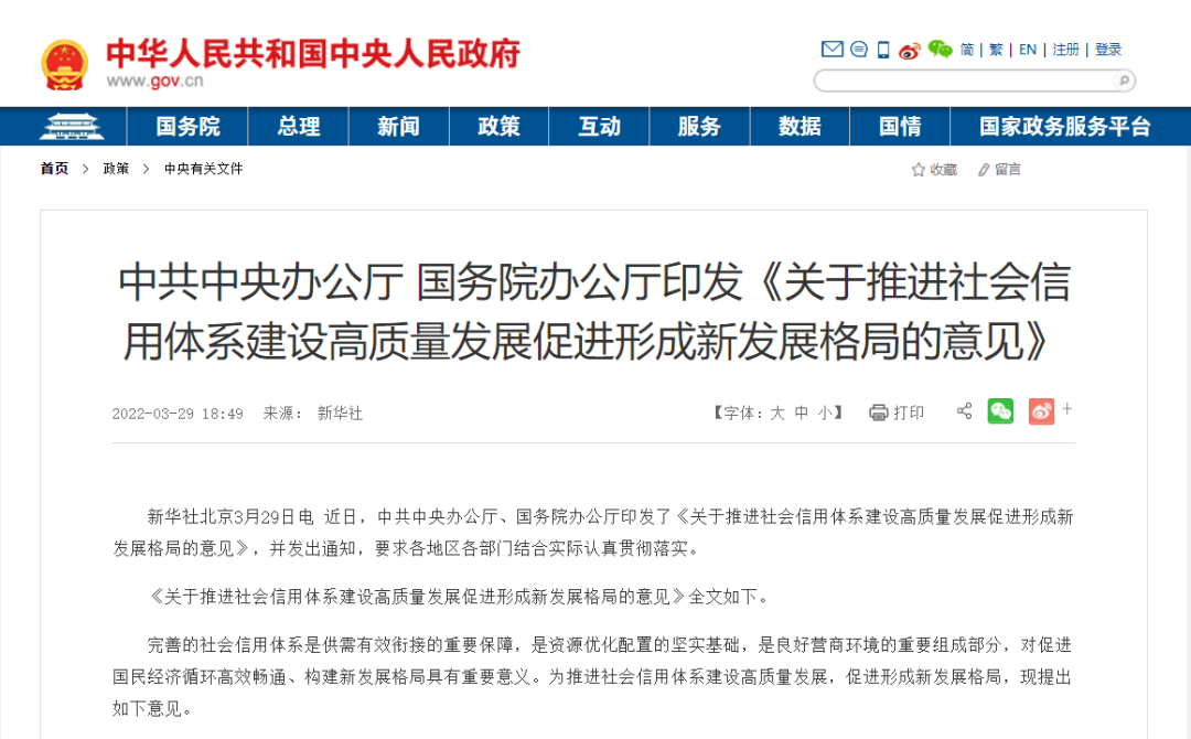 近日,中共中央办公厅、国务院办公厅印发了《关于推进社会信用体系建设高质量发展促进形成新发展格局的意见》,并发出通知,要求各地区各部门结合实际认真贯彻落实。
