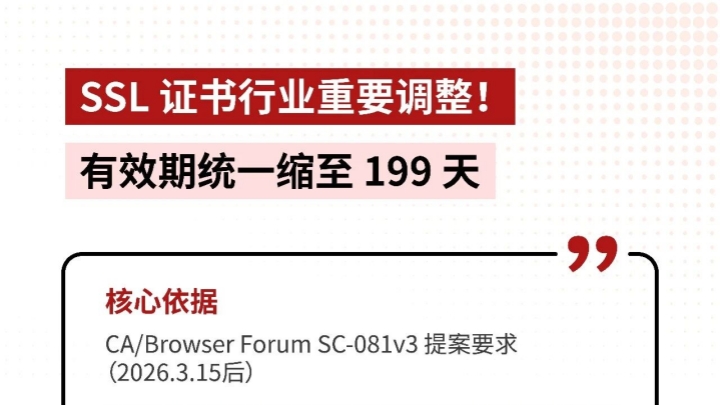 众所周知,SSL证书管理在今年4月份发生了重大变革。CA/B论坛通过 SC-081v3 提案,将SSL证书有效期从398天大幅缩短至47天(2029年3月15日起生效)。这一变革标志着全球网络安全合规进入“短周期、高频率”时代,传统的Excel台账+手动操作的方式不太现实且也无法应对这一挑战,